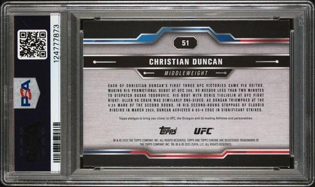 Add to wishlistCompareQuick view Combat Singles, SinglesTiffany Stratton 2025 Topps Chrome WWE x Cactus Jack Black & Yellow 16 $10.00 Add to cart Out Of Stock Add to wishlistCompareQuick view Combat Singles, SinglesRoman Kopylov 2025 Topps Chrome UFC Youthquake Rookie YTQ-6 PSA 9 $15.00 Read more Add to wishlistCompareQuick view Combat Singles, SinglesTrey Waters 2025 Topps Chrome UFC Rookie Auto RC CRA-TW PSA 10 Pop 1 $25.00 Add to cart Out Of Stock Add to wishlistCompareQuick view Combat Singles, SinglesReinier De Ridder 2025 Topps Chrome UFC Negative Refractor Rookie RC 185 PSA 9 $10.00 Read more Add to wishlistCompareQuick view Combat Singles, SinglesStephen Erceg 2025 Topps Chrome UFC Prism Refractor Rookie RC 63 PSA 10 Pop 1 $25.00 Add to cart Out Of Stock Add to wishlistCompareQuick view Combat Singles, SinglesDanny Barlow 2025 Topps Chrome UFC Red & Blue Refractor 179 PSA 9 $10.00 Read more Add to wishlistCompareQuick view Combat Singles, SinglesDaniel Zellhuber 2025 Topps Chrome UFC Red & Blue Refractor RC 189 PSA 10 Pop 1 $25.00 Add to cart Add to wishlistCompareQuick view Combat Singles, SinglesMarcus McGhee 2025 Topps Chrome UFC Red & Blue Refractor RC 121 PSA 10 Pop 1 $25.00 Add to cart Add to wishlistCompareQuick view Combat Singles, SinglesJoanderson Brito 2025 Topps Chrome UFC Red & Blue Refractor RC 176 PSA 9 $10.00 Add to cart Out Of Stock Add to wishlistCompareQuick view Combat Singles, SinglesTracy Cortez 2025 Chrome UFC Gold Geometric Future Stars Auto /50 PSA 10 Pop 1 $300.00 Read more Out Of Stock Add to wishlistCompareQuick view Combat Singles, SinglesJonathan Martinez 2025 Topps Chrome UFC Purple Refractor Rookie RC 80 PSA 9 $10.00 Read more Out Of Stock Add to wishlistCompareQuick view Combat Singles, SinglesDaniel Marcos 2025 Topps Chrome UFC Red & Blue Refractor RC 113 PSA 9 $10.00 Read more Out Of Stock Add to wishlistCompareQuick view Combat Singles, SinglesEduarda Moura 2025 Topps Chrome UFC Blue Refractor /150 Rookie 24 PSA 8 $10.00 Read more Out Of Stock Add to wishlistCompareQuick view Combat Singles, SinglesChristian Duncan 2025 Topps Chrome UFC Negative Refractor Rookie 51 PSA 9 $10.00 Read more Add to wishlistCompareQuick view Combat Singles, SinglesLeon Edwards 2025 Topps Chrome UFC Berzerker Case Hit SSP BZK-6 PSA 9 $30.00 Add to cart Add to wishlistCompareQuick view Combat Singles, SinglesHulk Hogan 2025 Panini Combat Anthology Mat Classics Signatures Ice Auto /25 $250.00 Add to cart PREVIOUS 1 2 3 NEXT