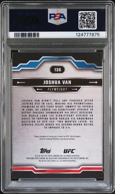 Add to wishlistCompareQuick view Combat Singles, SinglesKhamzat Chimaev 2022 Donruss Optic UFC Star Gazing Pink /25 8 $60.00 Add to cart Add to wishlistCompareQuick view Combat Singles, SinglesZhang Weili 2024 Topps Gold Label UFC Gold Splatter GSP-28 $35.00 Add to cart Add to wishlistCompareQuick view Combat Singles, SinglesJoshua Van 2025 Topps Chrome UFC Purple Refractor RC 136 PSA 10 Pop 3 $90.00 Add to cart Add to wishlistCompareQuick view Combat Singles, SinglesJack Della Maddalena 2025 Topps Now Orange Foil /25 UFC 315 13 PSA 9 $75.00 Add to cart Add to wishlistCompareQuick view Combat Singles, SinglesJoshua Van 2025 Topps Chrome UFC Green Refractor Auto /99 RC CRA-JV $150.00 Add to cart Add to wishlistCompareQuick view Combat Singles, SinglesAngela Hill 2019 Topps Chrome UFC Auto FA-AHI $10.00 Add to cart Add to wishlistCompareQuick view Combat Singles, SinglesWestin Wilson 2025 Topps Chrome UFC Orange Geometric /25 108 $10.00 Add to cart Add to wishlistCompareQuick view Combat Singles, SinglesJoanderson Brito 2025 Topps Chrome UFC Red & Blue Refractor RC 176 PSA 9 $10.00 Add to cart Add to wishlistCompareQuick view Combat Singles, SinglesLeon Edwards 2025 Topps Chrome UFC Berzerker Case Hit SSP BZK-6 PSA 9 $20.00 Add to cart Out Of Stock Add to wishlistCompareQuick view Combat Singles, SinglesHulk Hogan 2025 Panini Combat Anthology Mat Classics Signatures Ice Auto /25 $225.00 Read more Add to wishlistCompareQuick view Combat Singles, SinglesMatt Hughes 2024 Topps Finest UFC Red Intimidators Auto /5 IA-MHS PSA 10 $300.00 Add to cart Add to wishlistCompareQuick view Combat Singles, SinglesMagomed Ankalaev 2024 Topps Gold Label UFC Quest for Gold Black Auto /10 QGS-MAN $40.00 Add to cart Add to wishlistCompareQuick view Combat Singles, SinglesDustin Poirier 2025 Topps Chrome UFC Black Geometric /2 7 $450.00 Add to cart Add to wishlistCompareQuick view Combat Singles, SinglesAdrian Yanez 2023 Panini Prizm UFC Gold Refractor /10 Bantamweight #6 $15.00 Add to cart Add to wishlistCompareQuick view Combat Singles, SinglesKhamzat Chimaev 2022 Panini Chronicles UFC Gold Flux Auto /10 #FX-KHM PSA 9 $350.00 Add to cart Add to wishlistCompareQuick view Combat Singles, SinglesDaniel Cormier 2019 Topps Chrome UFC 1984 Auto /5 84T-DC PSA 10 $275.00 Add to cart PREVIOUS 1 2 3 NEXT
