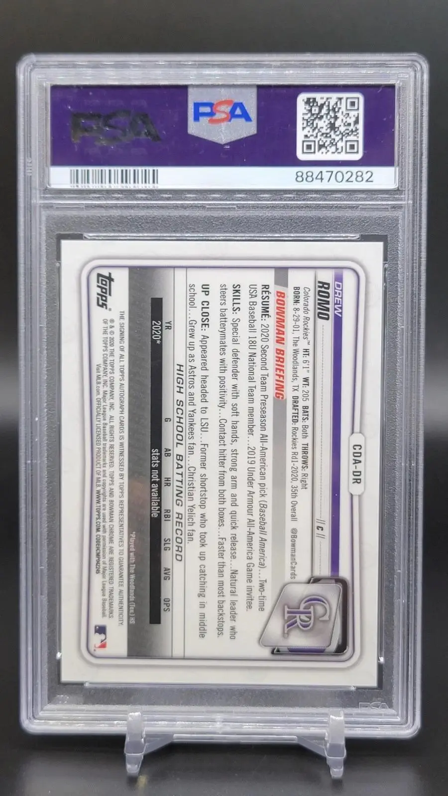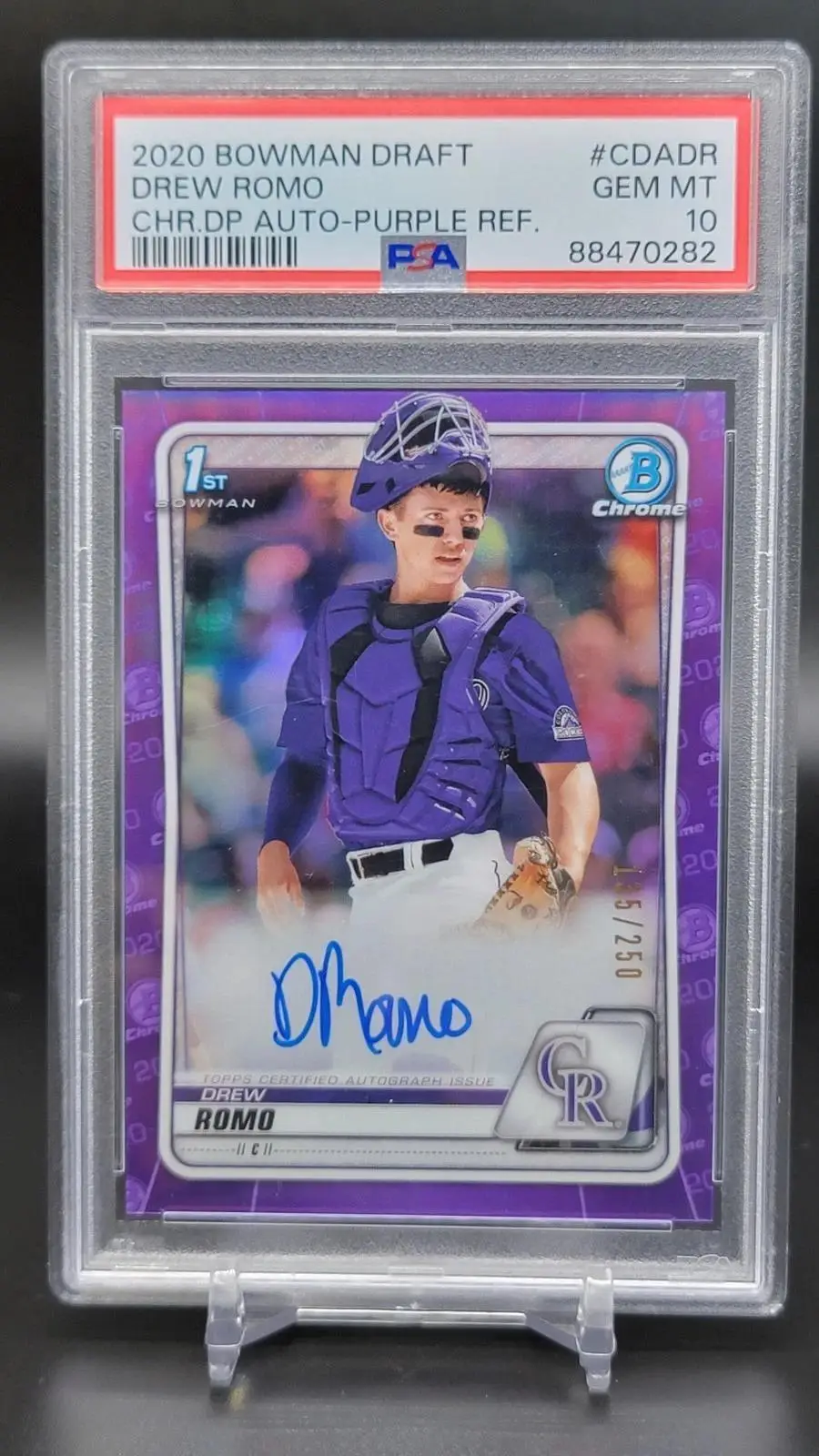 Drew Romo 2020 Bowman Draft 1st Chrome Purple Auto /250 Rockies CDA-DR PSA 10