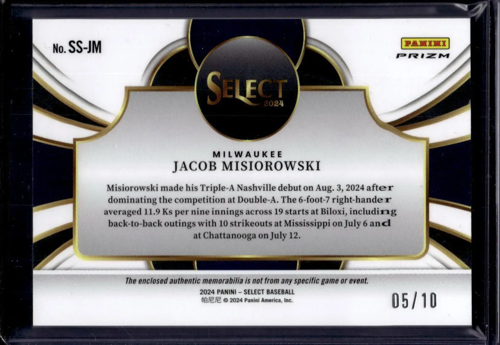 Jacob Misiorowski 2024 Panini Select Selective Swatches Gold /10 Milwaukee Brewers SS-JM