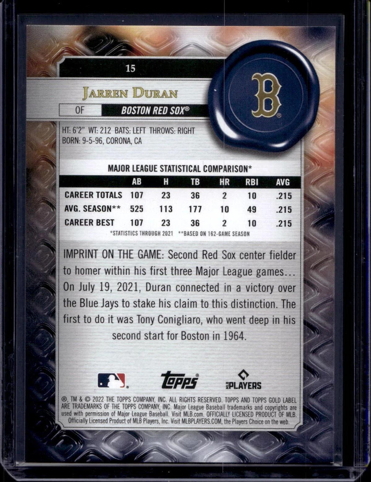 Jarren Duran 2022 Topps Gold Label Class 1 Red /75 Boston Red Sox 15