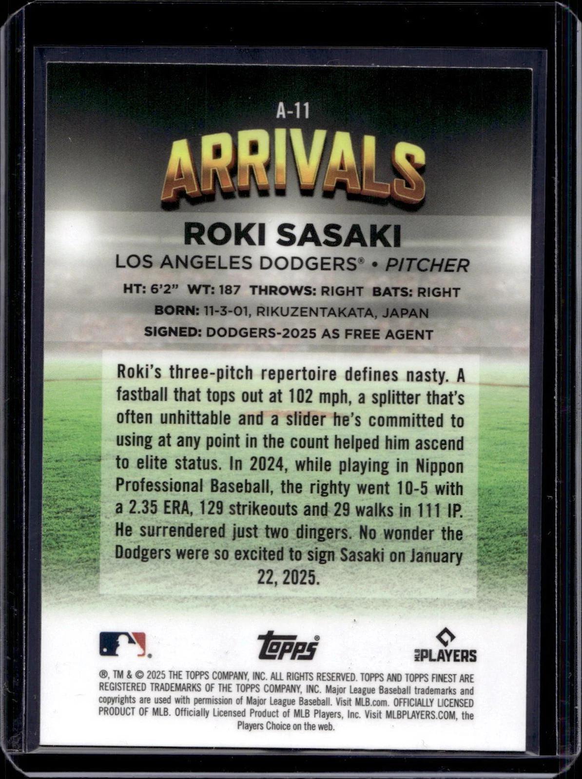 Roki Sasaki 2025 Topps Finest Arrivals Purple /125 Los Angeles Dodgers A-11