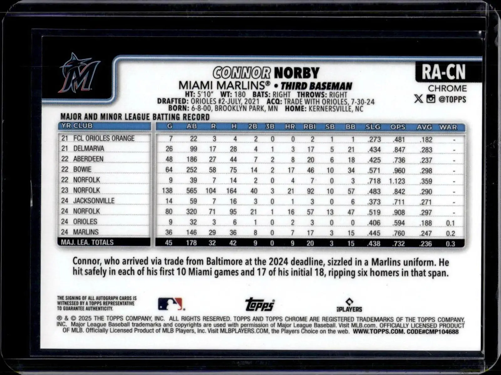 • Connor Norby 2025 Topps Chrome Logofractor Rookie Green Auto /99 Marlins RA-CN