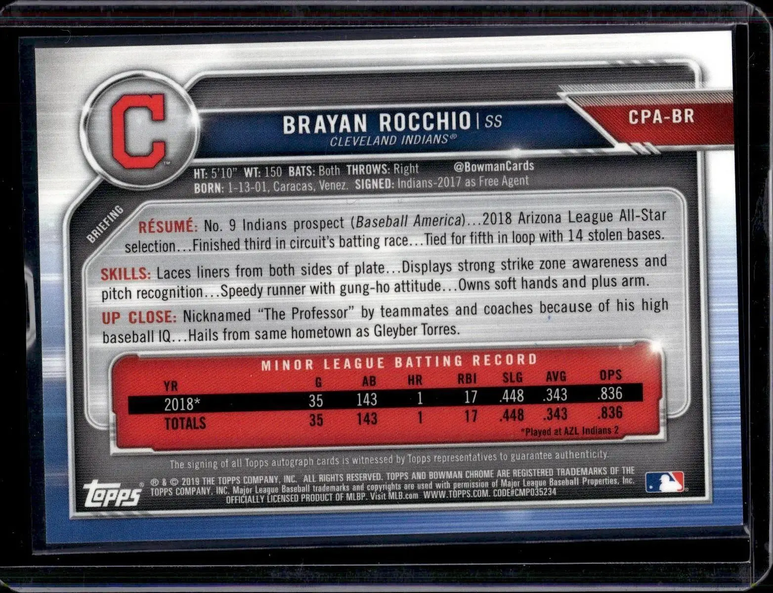 Brayan Rocchio 2019 Bowman Chrome 1st Auto Cleveland Indians CPA-BR